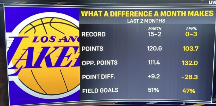 在洛杉矶湖人队“赛季尾声”的断崖式滑坡中,一道关于“竞技状态”的残酷折线图,正由知名转播机构TNT Sports向全球独家披露。近日,TNT在转播席上展示了湖人“三月与四月数据”的惊悚对比:从三月份